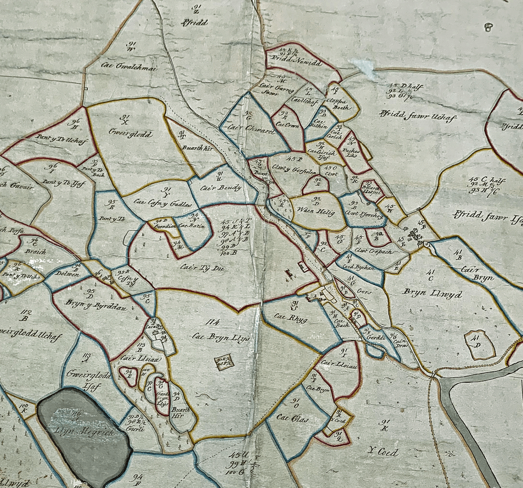 Rhan o fap Arolwg 1768, yn dangos ardal Coed y Parc a Chilgeraint. Gwelir Cae Gwalchmai yn ymestyn ar hyd glan afon Caledffrwd ( Yr Ocar ). Tir Cilgeraint sydd yr ochr arall i’r afon ( APG PENRA 2009 )