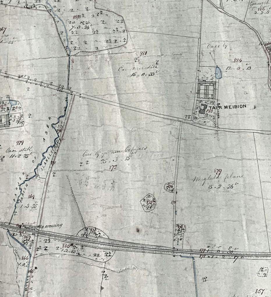 ‘ a parcel of land called Cae’r Clochydd, bounded on the south east by the river Ffrydlas, and, on the west, by the road leading from Pencarneddi to Bont Uchaf’.